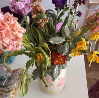 De ese cuadro salió otro, y después otro. Y con cada flor voy buscando un lenguaje, y menos control. La sorpresa fue que, cuando el ramo empezó a marchitarse, lo vi aún más hermoso: las hojas deshidratándose, los colores más apagados pero más interesantes, la pérdida de pétalos, la caída del peso del ramo desvaneciéndose… Entendí que en el paso del tiempo también hay belleza, que a veces lo marchito potencia lo vivo.